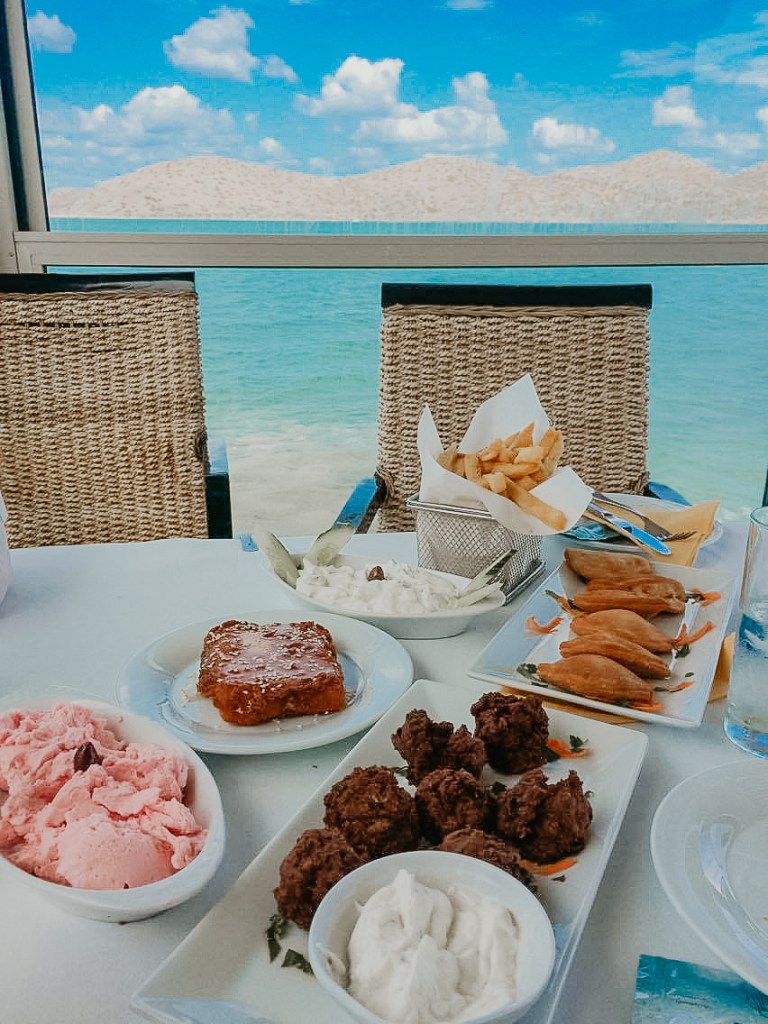Op de foto heb je verschillende mezze gerechtjes die je zeker eens moet proberen als je in Griekenland bent. Het roze is Taramasalata, daarboven heb je de crunchy feta en het wit gerechtje is Tsatziki. Overheerlijk!